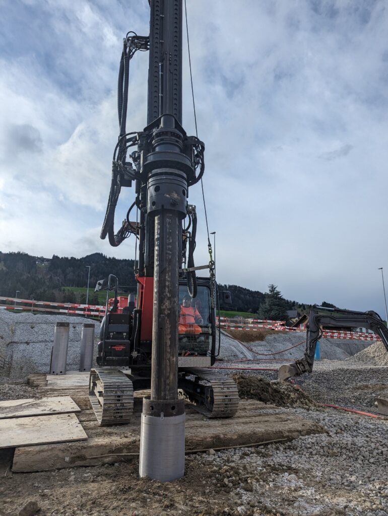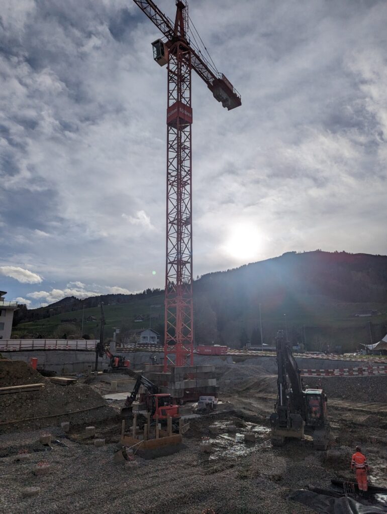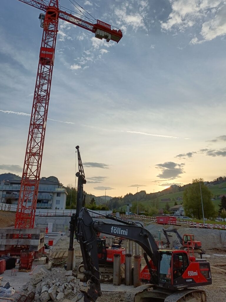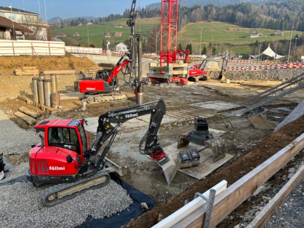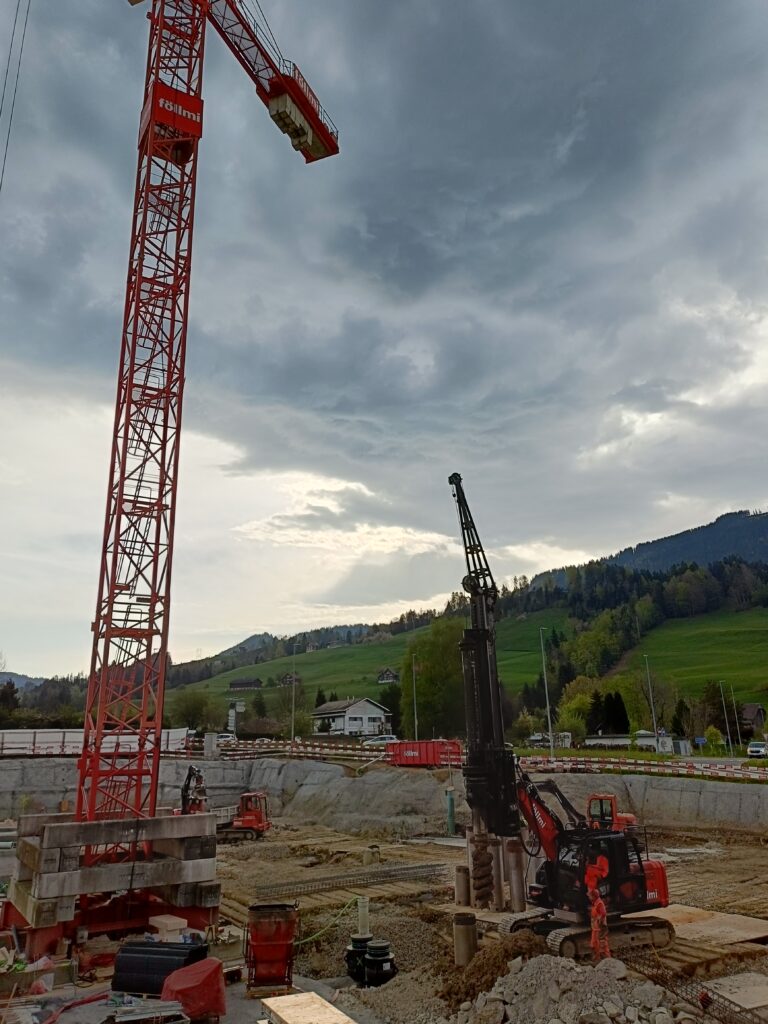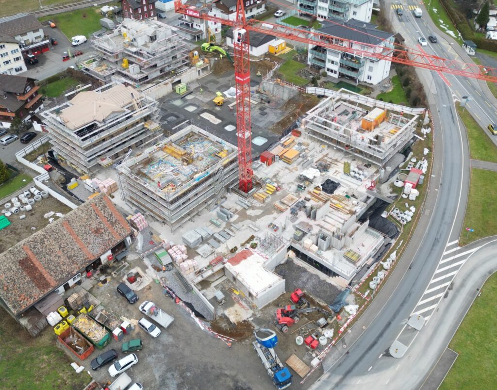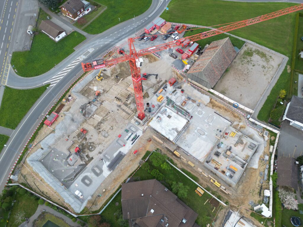 Überbauung mit vier Mehrfamilienhäusern und einer grossen Tiefgarage. Insgesamt entstehen 32 Wohneinheiten mit 60 Parkplätzen. Für uns ein Gesamtauftrag mit Aushub, Pfahlfundation und Baumeisterarbeiten. Die Aussenwände im Untergeschoss werden in vorfabrizierten Doppelwänden erstellt. Bei den Wohnungsdecken kommen vorfabrizierte Deckenelemente zum Zug.