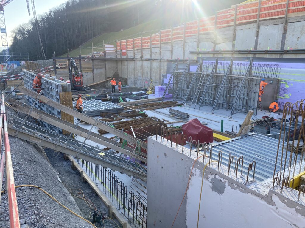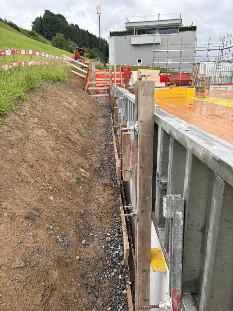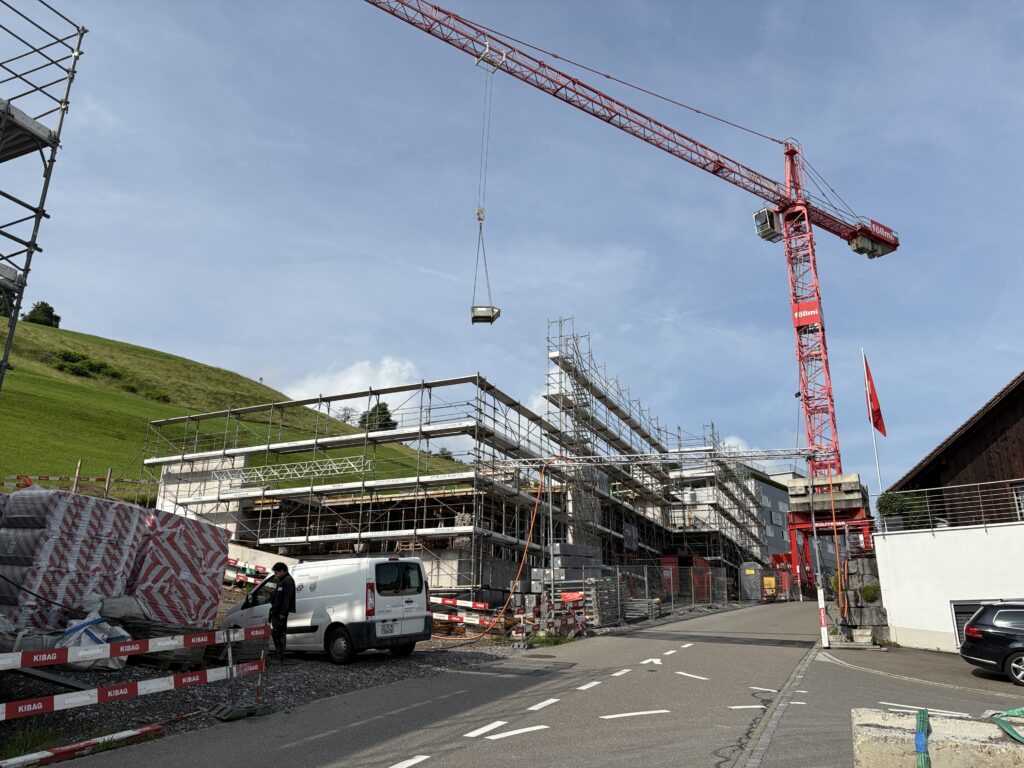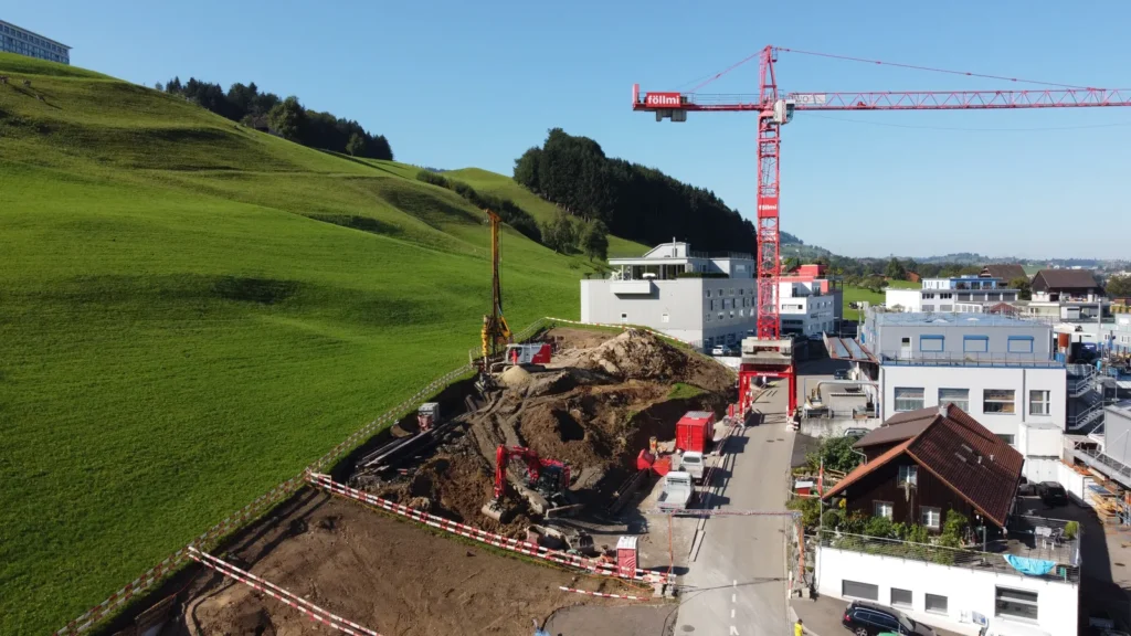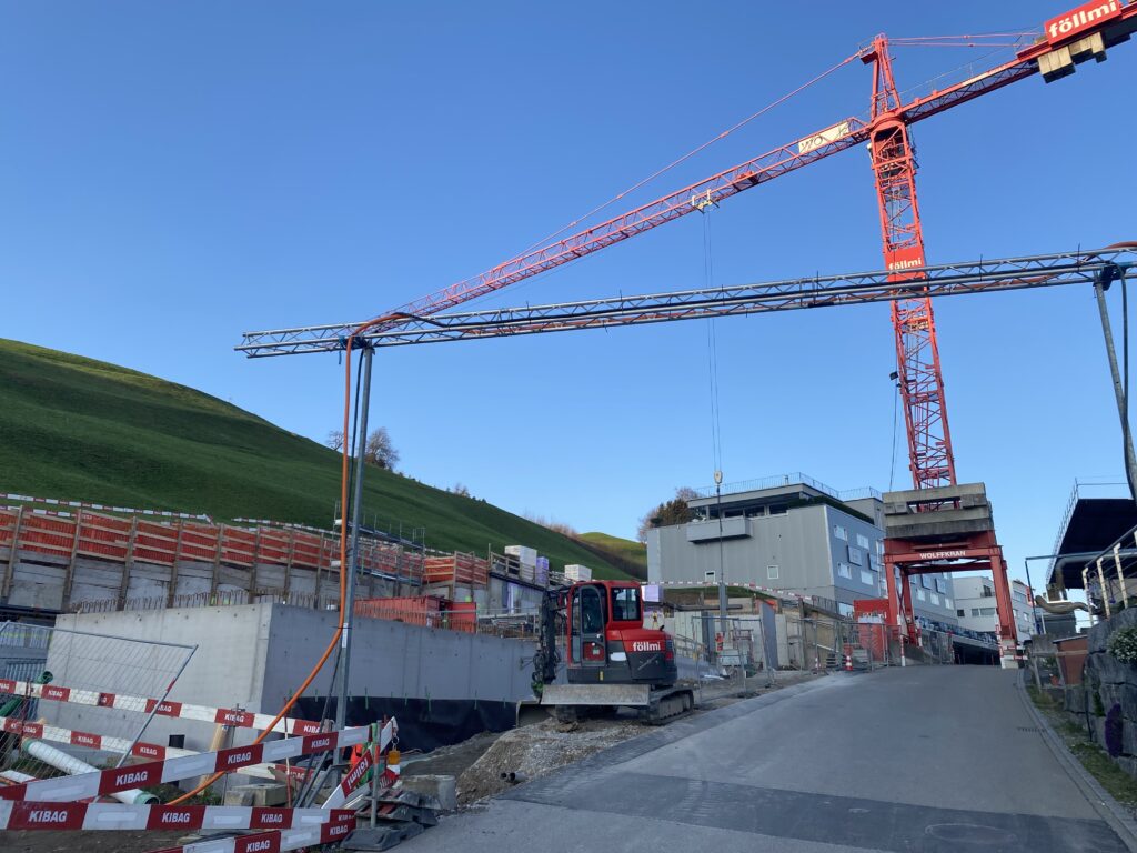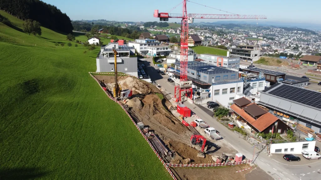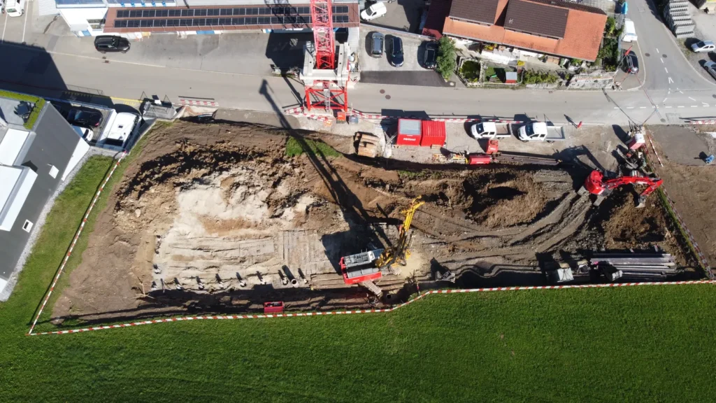 Neben unserem Werkhof und Bürogebäude entsteht an der Firststrasse 10 in Feusisberg ein neues Gewerbehaus, das besonders auf Nachhaltigkeit und eine solide Bauweise setzt. Ausgestattet mit einer Erdsondenwärmepumpe und einer Photovoltaikanlage, wird das Gebäude sowohl auf erneuerbare Energien als auch auf effiziente Wärmegewinnung setzen. Etwa 6000 m³ Aushub und 5500 m³ Fels werden abgetragen. Die Rühlwand wird zusätzlich mit 10 Meter langen Ankern gesichert. Die Baumeisterarbeiten beginnen Anfang März, wobei etwa 2200 m³ Beton verarbeitet und insgesamt 43 Stützen gesetzt werden. Dieses zukunftsorientierte Bauprojekt legt großen Wert auf eine ressourcenschonende Energieversorgung, die den CO₂-Ausstoß reduziert und gleichzeitig die Betriebskosten des Gebäudes nachhaltig senkt.