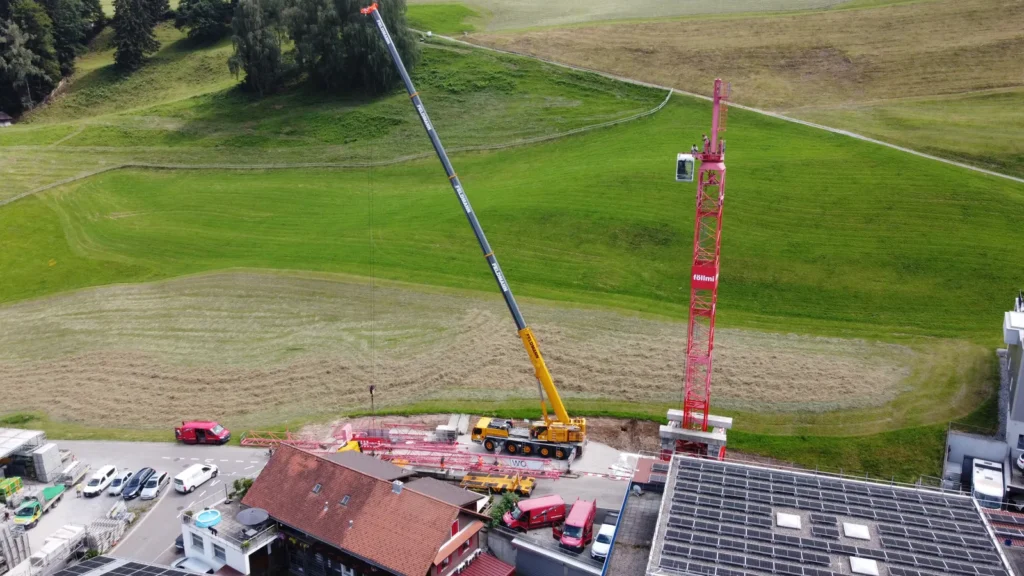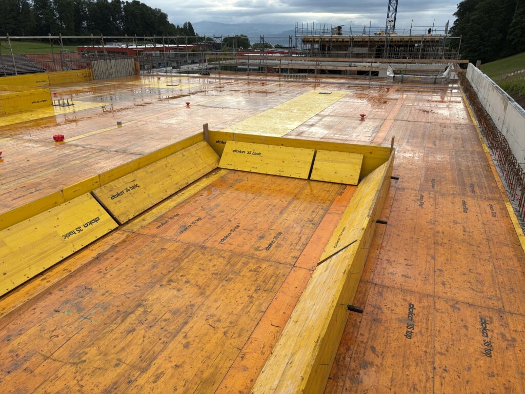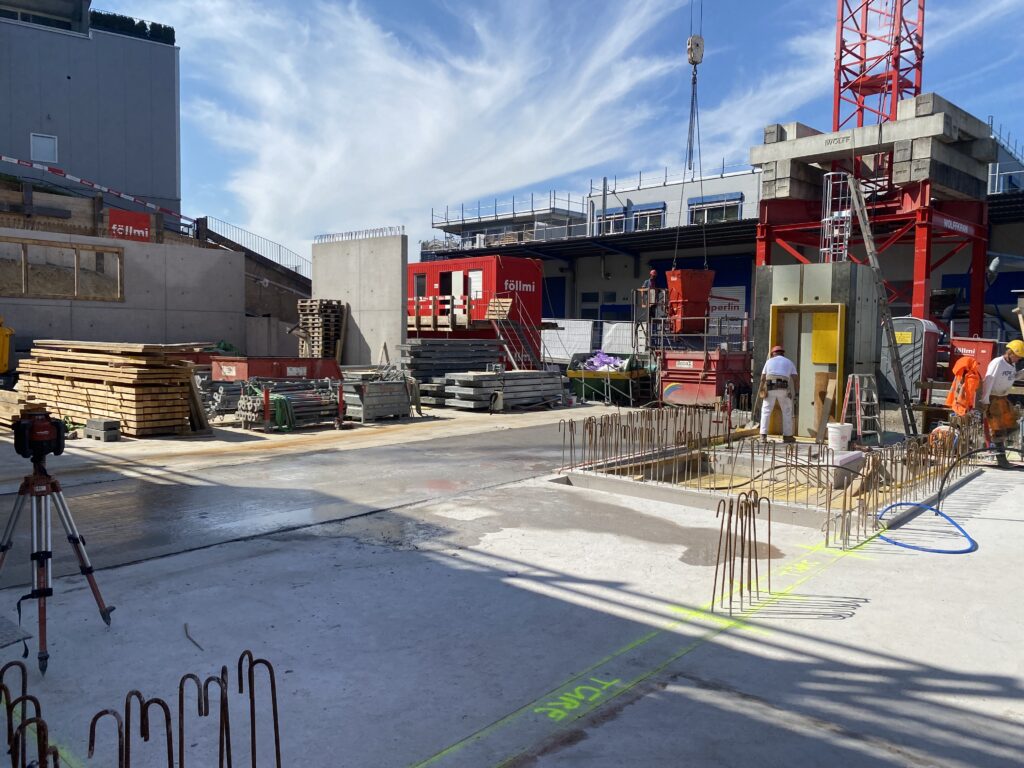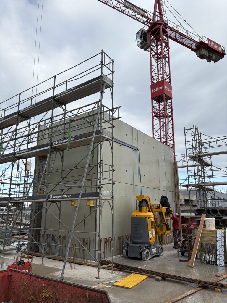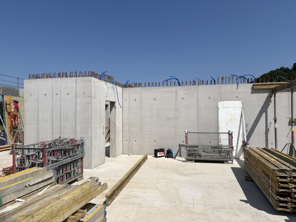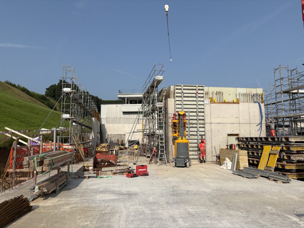 Neben unserem Werkhof und Bürogebäude entsteht an der Firststrasse 10 in Feusisberg ein neues Gewerbehaus, das besonders auf Nachhaltigkeit und eine solide Bauweise setzt. Ausgestattet mit einer Erdsondenwärmepumpe und einer Photovoltaikanlage, wird das Gebäude sowohl auf erneuerbare Energien als auch auf effiziente Wärmegewinnung setzen. Etwa 6000 m³ Aushub und 5500 m³ Fels werden abgetragen. Die Rühlwand wird zusätzlich mit 10 Meter langen Ankern gesichert. Die Baumeisterarbeiten beginnen Anfang März, wobei etwa 2200 m³ Beton verarbeitet und insgesamt 43 Stützen gesetzt werden. Dieses zukunftsorientierte Bauprojekt legt großen Wert auf eine ressourcenschonende Energieversorgung, die den CO₂-Ausstoß reduziert und gleichzeitig die Betriebskosten des Gebäudes nachhaltig senkt.