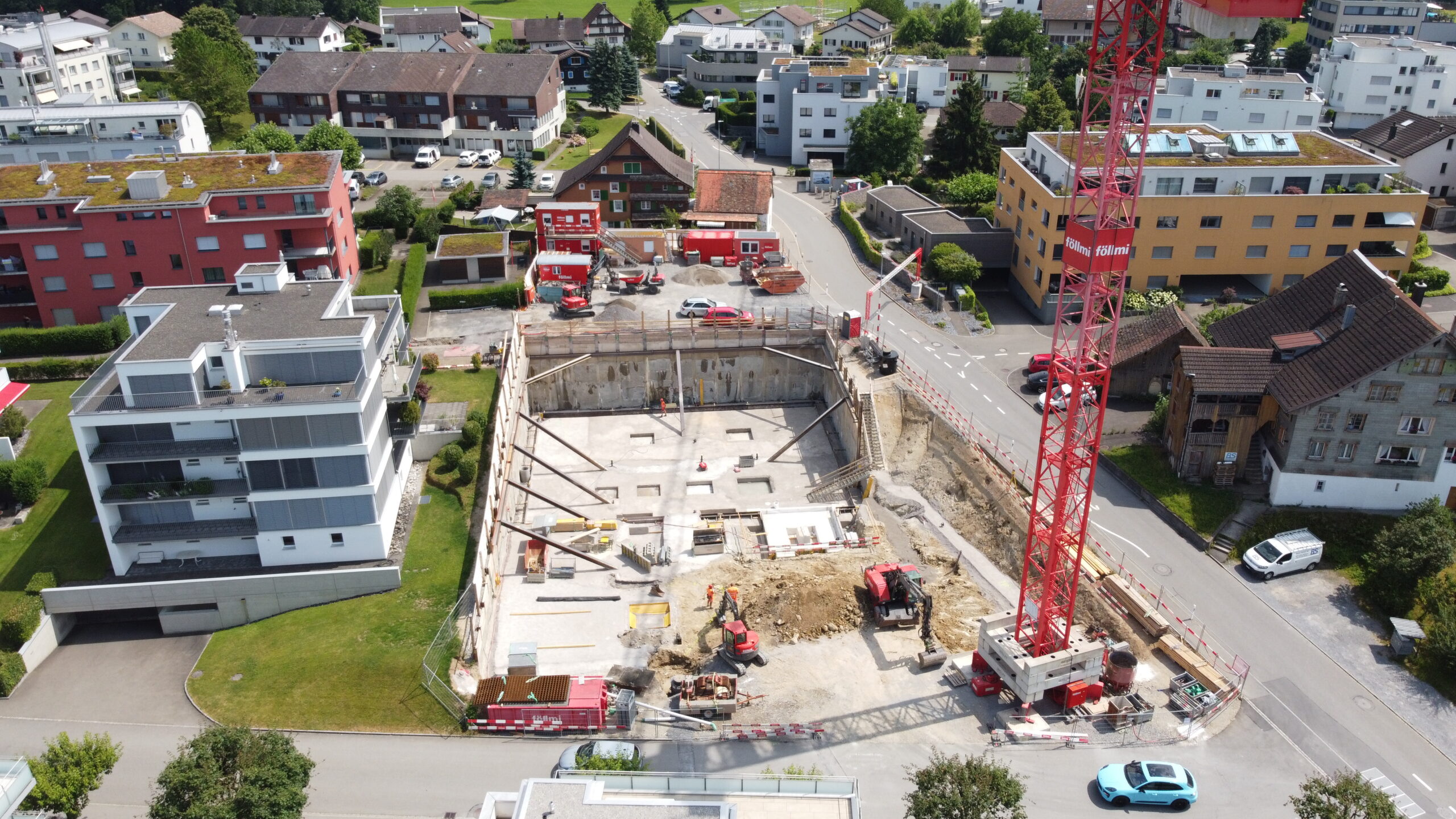 Die Tiefbauarbeiten laufen voraussichtlich bis Ende Juni 2025. Im Anschluss daran starten wir in Etappen mit den Hochbauarbeiten welche 2 Untergeschosse sowie 4 überirdische Geschosse umfassen wird.