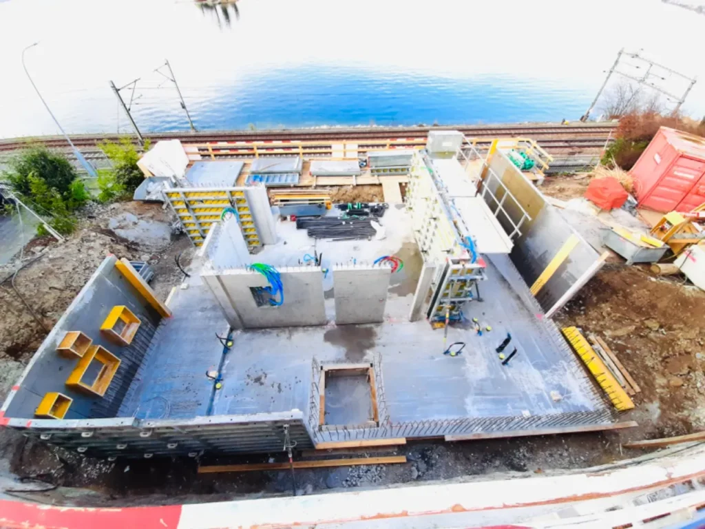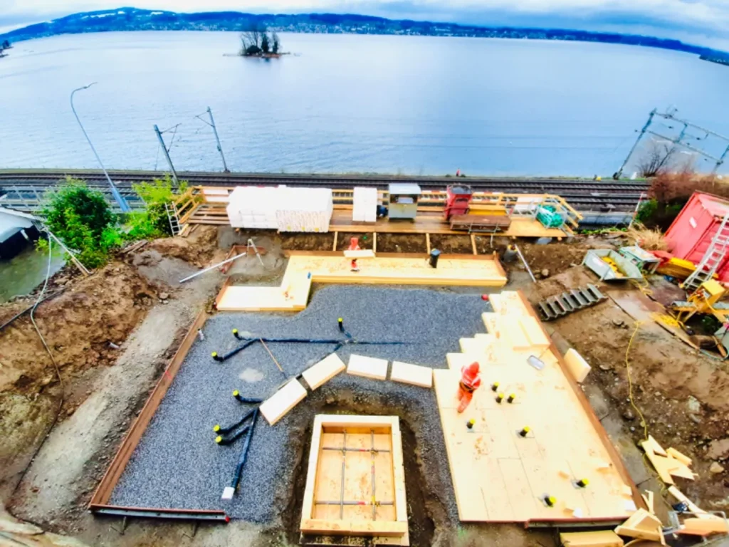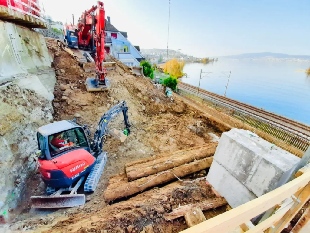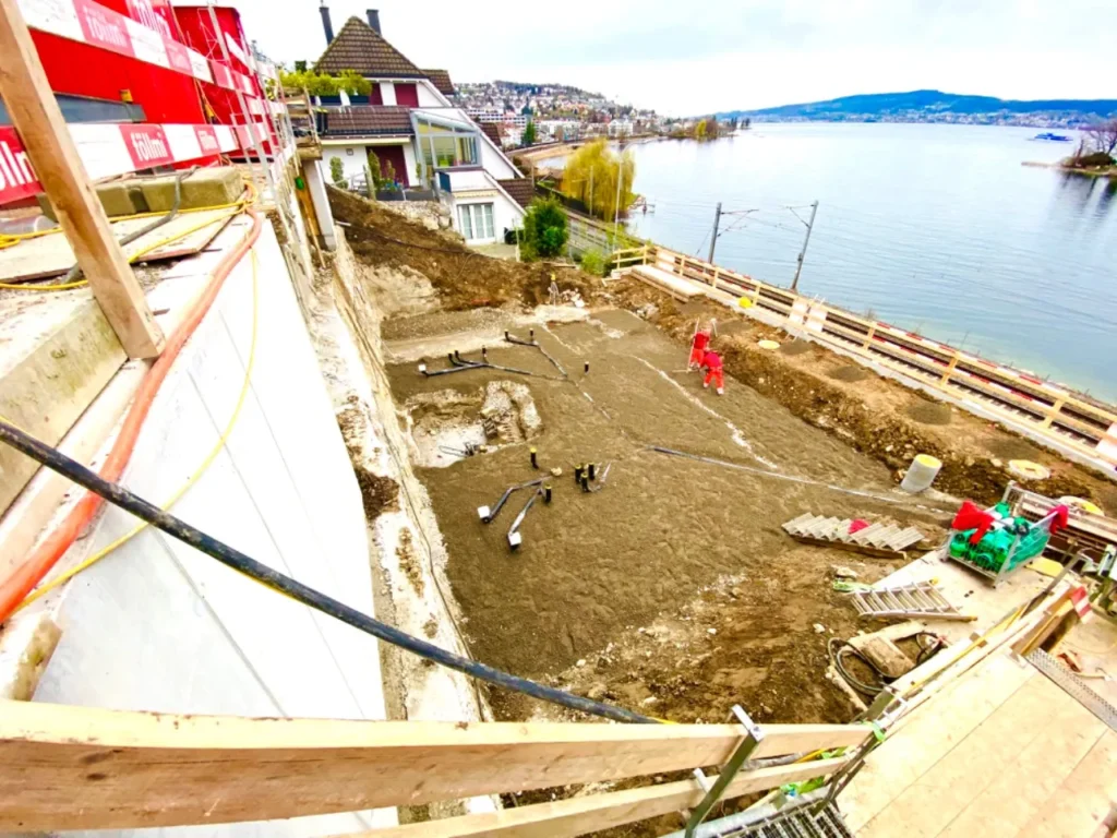 Ein interessantes Gesamtprojekt mit Abbruch, Spezialtiefbau und Hochbau. Die grössten Herausforderungen an diesem Objekt sind die engen Platzverhältnisse der Baustelle. Das Objekt liegt direkt an der Seestrasse und der Bahnlinie. Die Böschungssicherung wird mit einer Nagelwand gemacht, welche in Etappen gleichzeitig mit dem Abbruch erstellt wird. Der Neubau wird konventionell erstellt, bei welchem die grossen Auskragungen der Balkone ins Auge stechen.