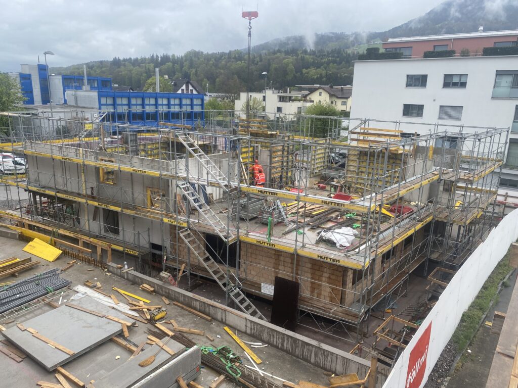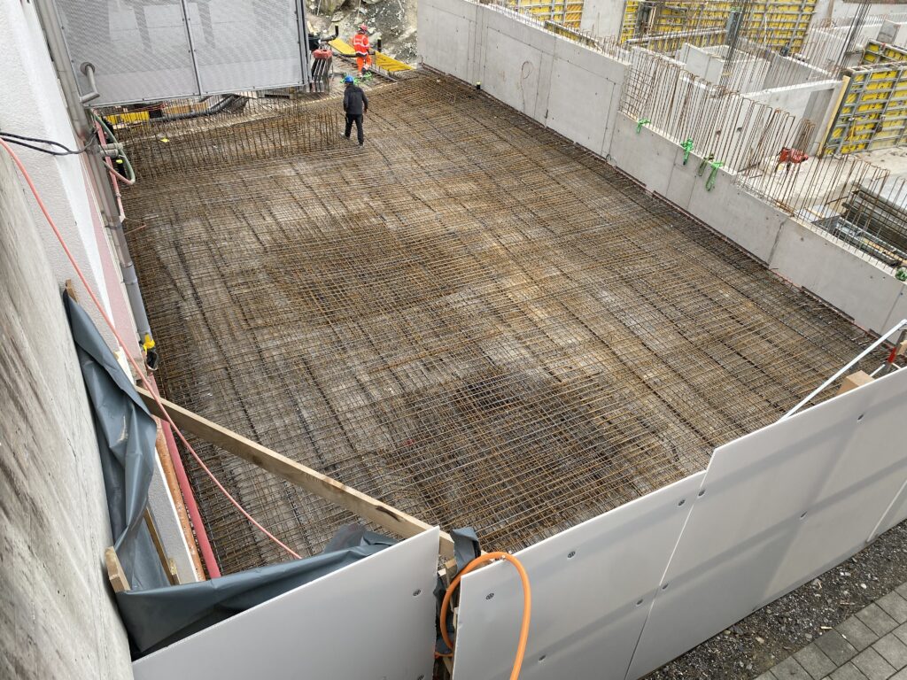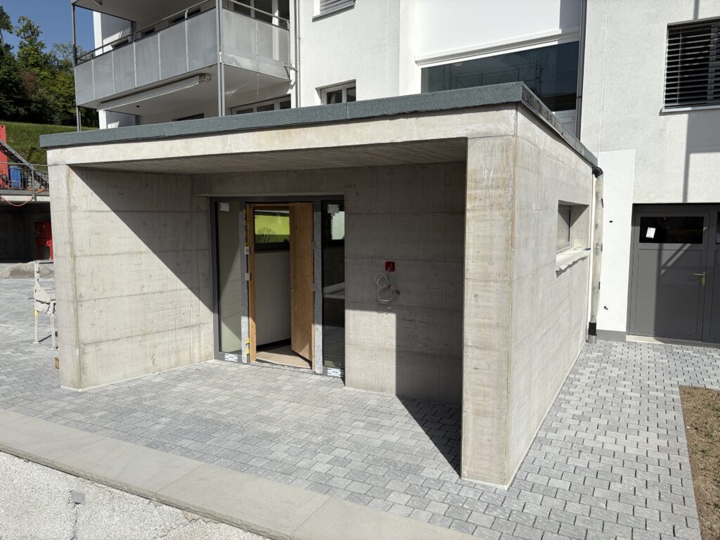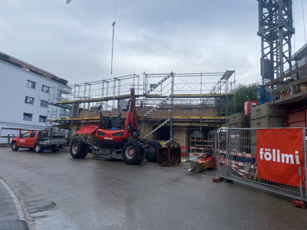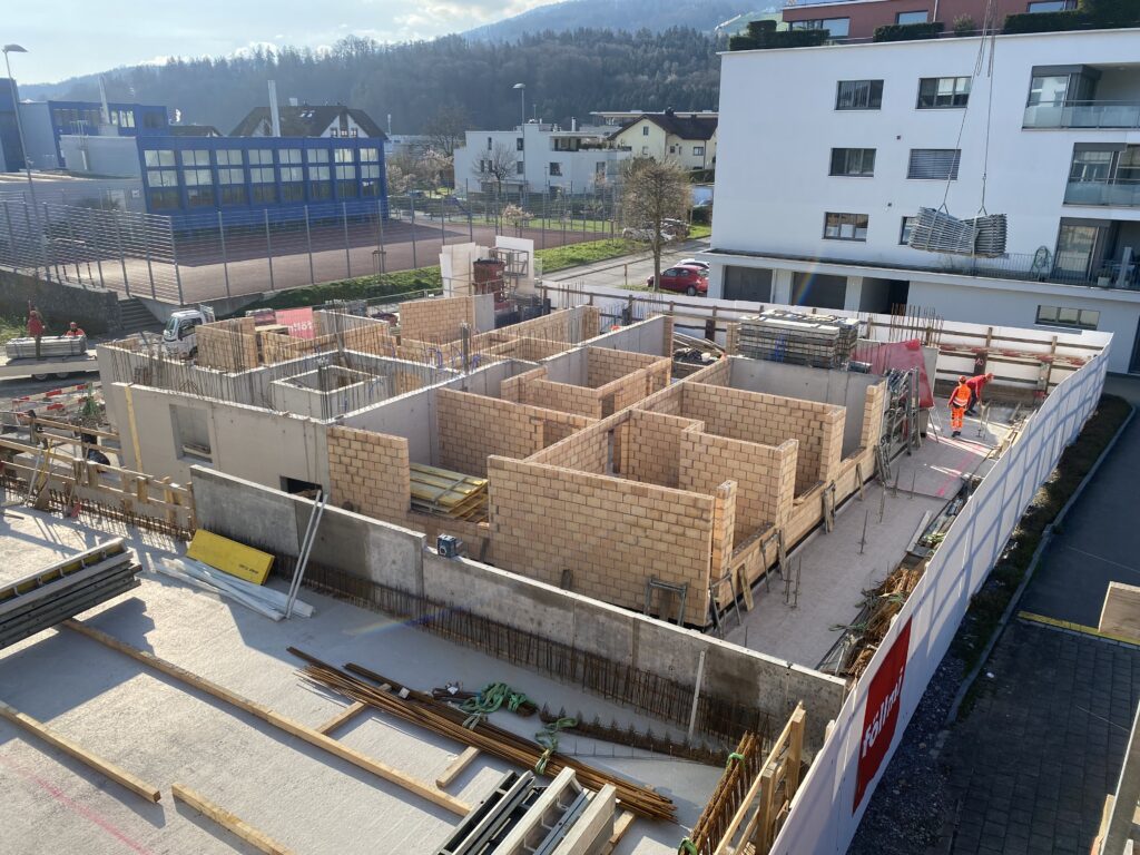 Im Zuge der aktuellen Bauarbeiten erfolgt auch der Umstieg von einer Gasheizung auf eine nachhaltige Erdsondenheizung. Zusätzlich werden die rechts vom Eingang liegenden Garagen in Abstellräume umgenutzt, wofür bereits mehrere Kalksandsteinwände eingezogen wurden.