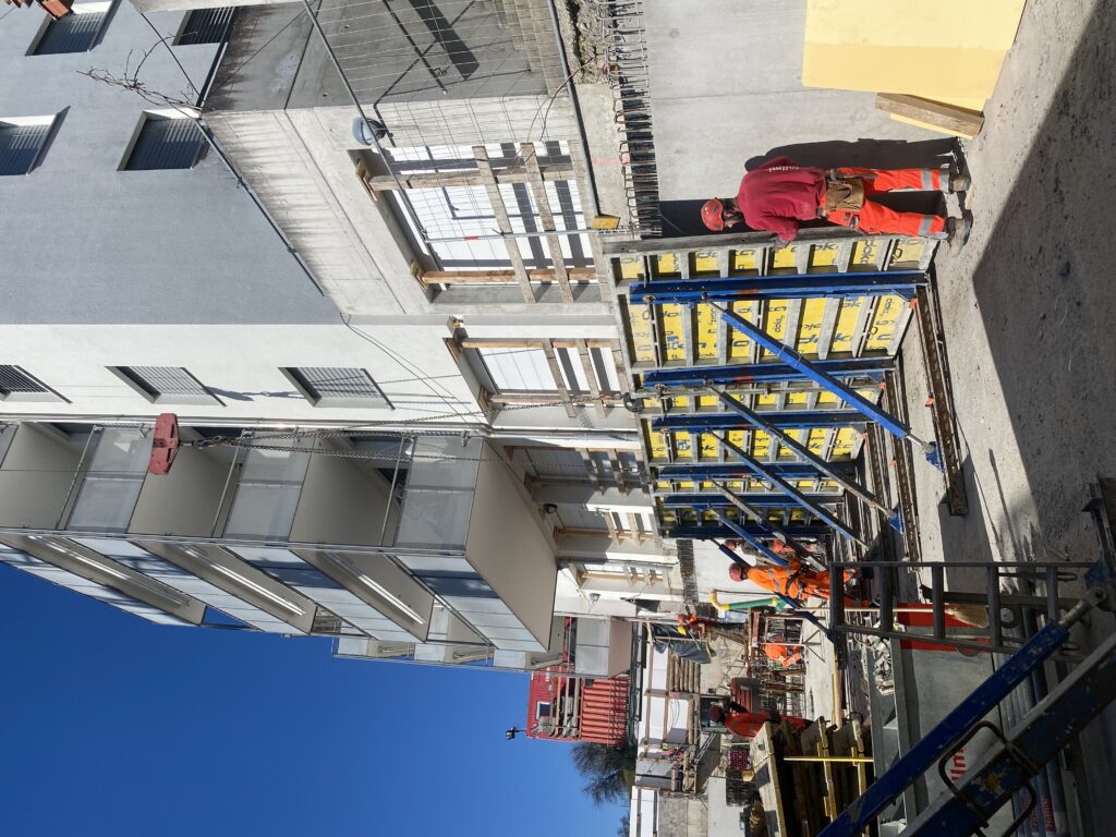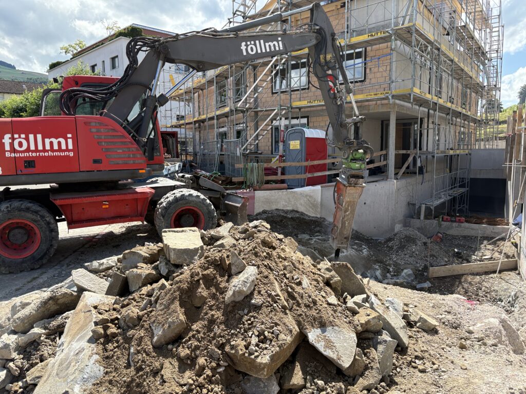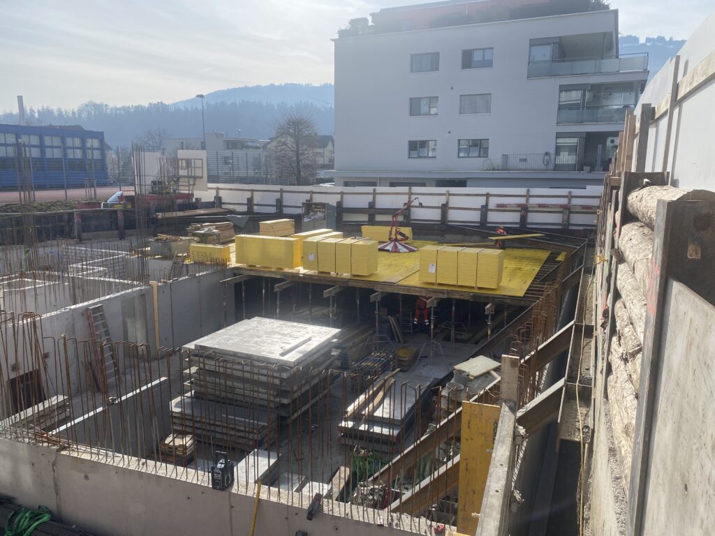 Beim Mehrfamilienhaus an der Leutschenstrasse 41 wird derzeit eine Tiefgarage im vorderen Bereich angebaut. Die bestehende Liegenschaft verfügt über keinen Keller. Parallel dazu entsteht auf dem angrenzenden Grundstück an der Rebhaldenstrasse ein kleines Mehrfamilienhaus (MFH Familia), das sich die gemeinsame Einfahrt zur Tiefgarage mit dem Nachbargebäude teilt.