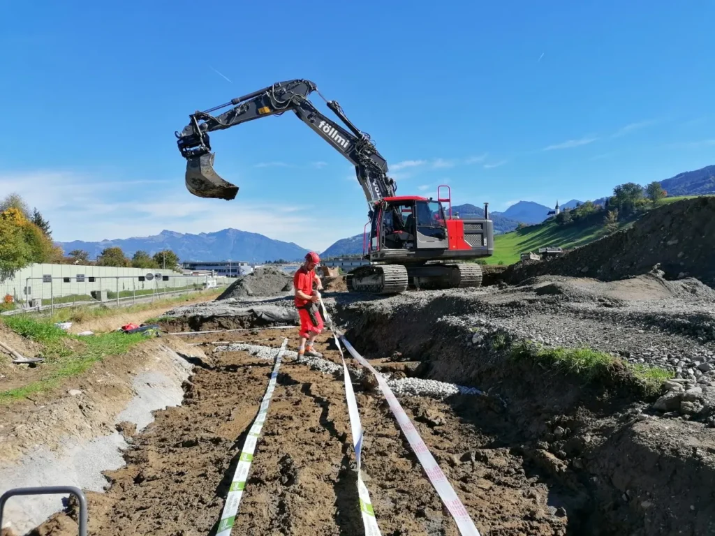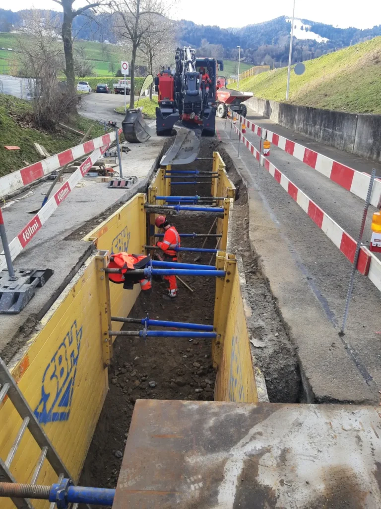 In Altendorf wird die Hauptleitung des Fernwärmenetzes erweitert. Los 54 Bitzi ab der Haldenstrasse, entlang der Autobahn im Wiesland, bis Burggasse, dann über den Sportplatz bis zur Oberdorfstrasse.