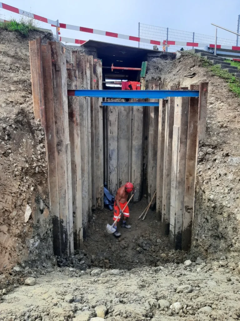Beim Übergang Burggasse ins Wiesland und vom Wiesland in die Haldenstrasse gibt es anspruchsvolle Spundwände, um die Terrainunterschiede zu überbrücken. Da die Rohrbauer ausschliesslich mit 90° arbeiten, muss in der Böschung senkrecht abgegraben werden und die Grabensicherung mittels Spundwänden und Ortsbeton erstellt werden.