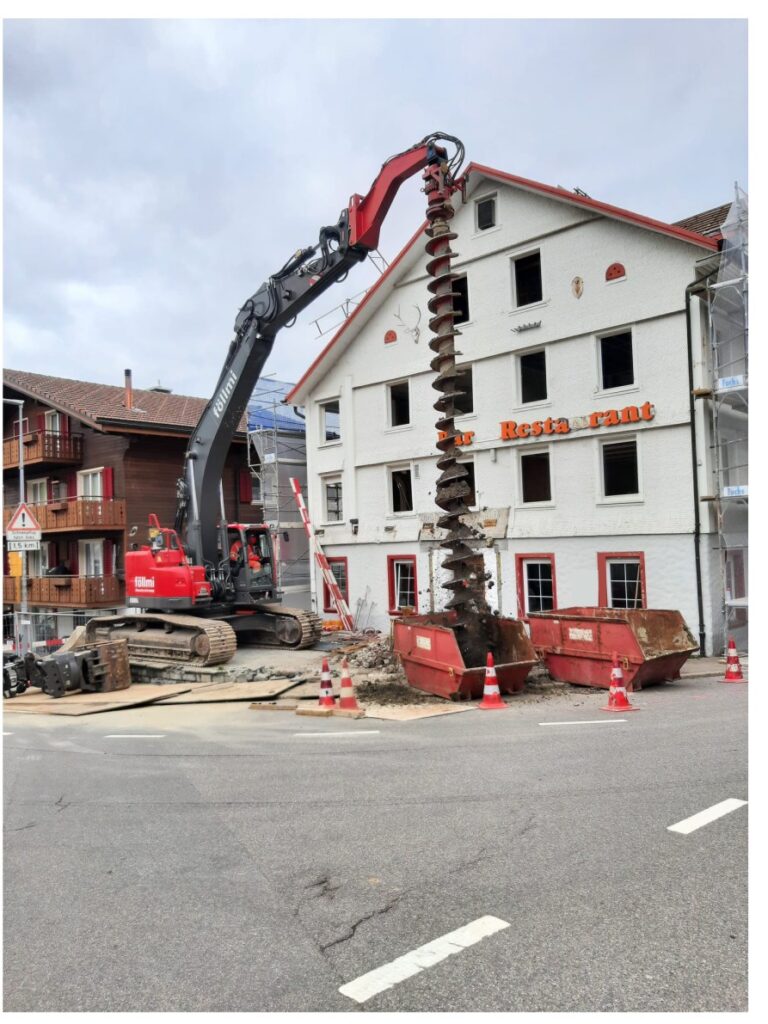 Mitten im Dorfkern von Oberiberg haben wir den Gesamtauftrag von Rückbau über den Aushub mit Baugrubensicherung bis und mit Hochbau des prestigeträchtigen Restaurants Schlüssel erhalten. Die beengten Platzverhältnisse stellen eine spezielle Herausforderung dar. Die Arbeiten durften erst nach der alljährlichen Wintersperre Ende März starten und dauern bis zur Rohbauvollendung Ende August. Sämtliche Leistungen werden von uns selbst ausgeführt, auch die Rühlwandträger, welche wir mit unserem eigenen Bohrsystem erstellen können und dadurch einiges an Zeit einsparen.
