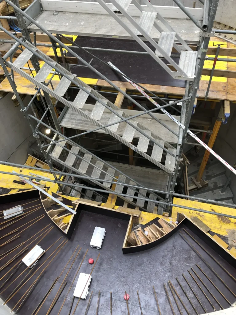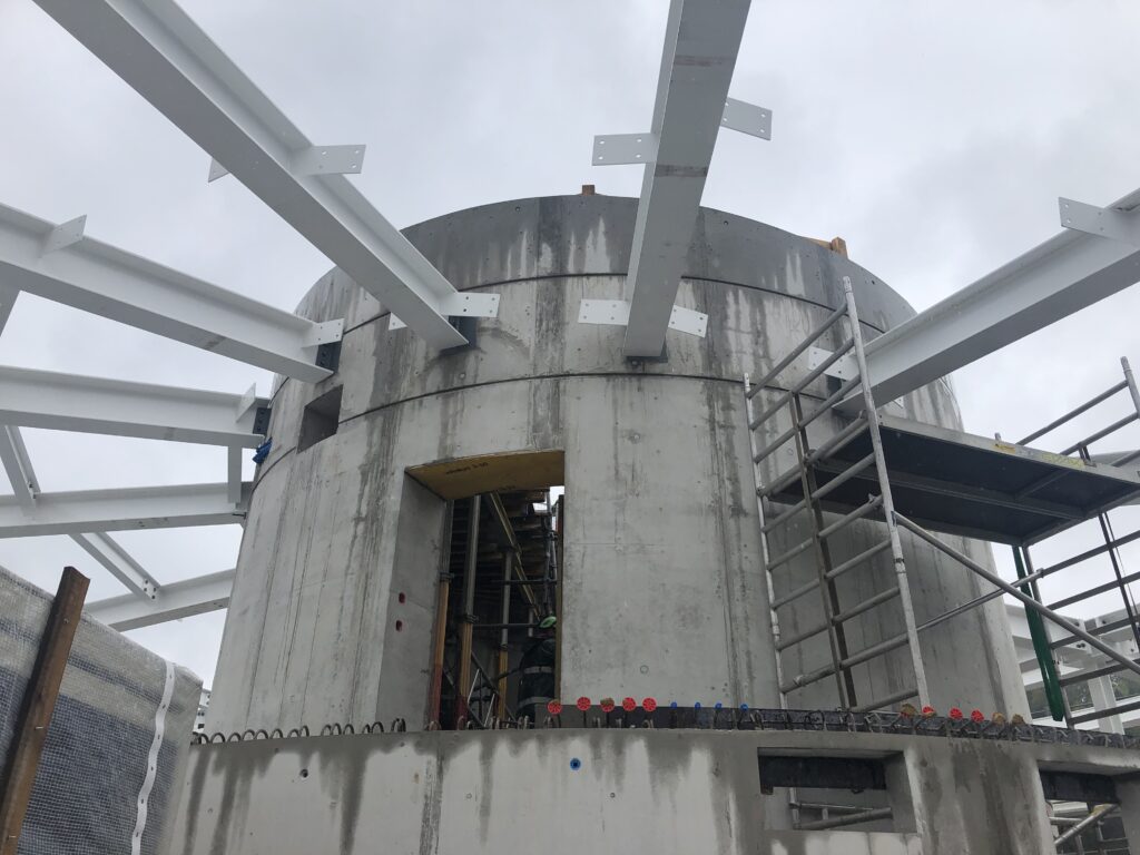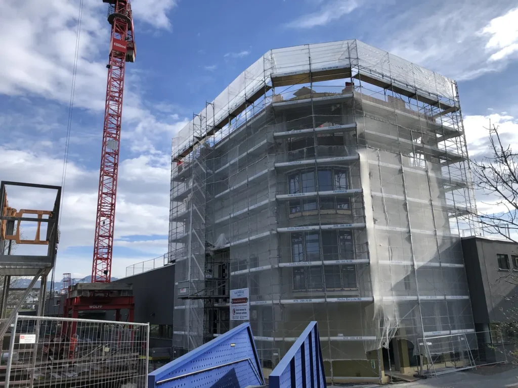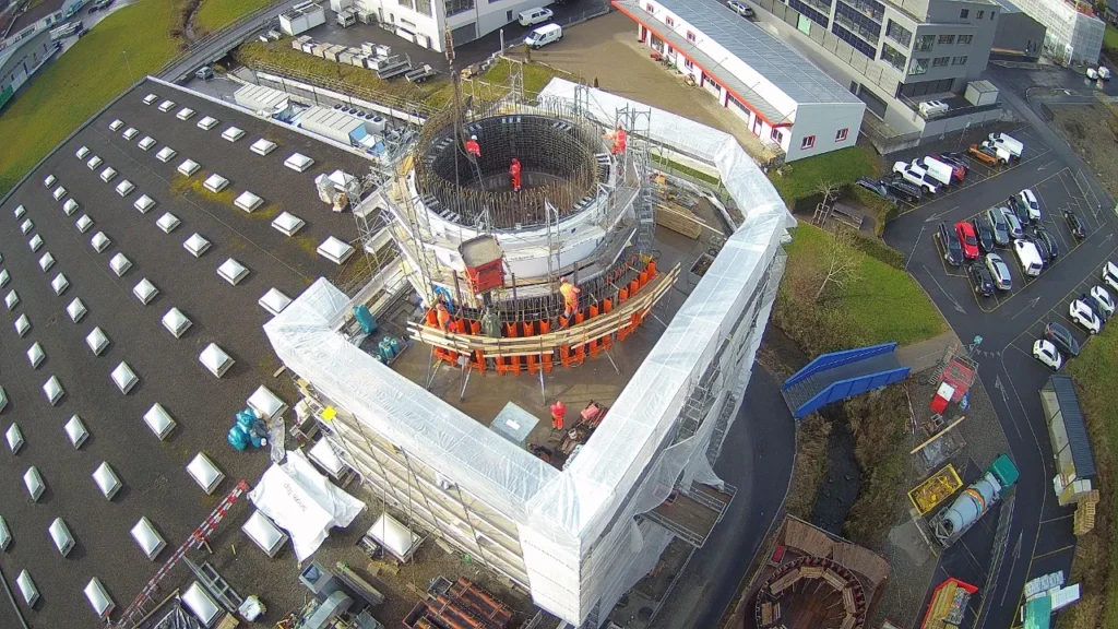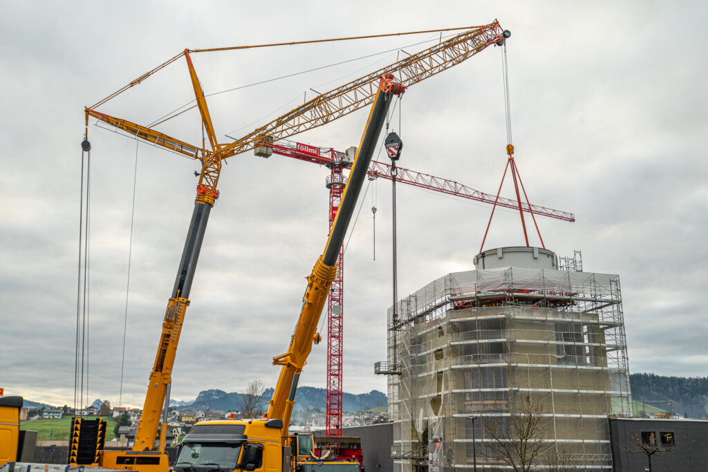 Die Firma Leuthold Mechanik AG realisiert in Einsiedeln ein Neubau mit einer Betriebskantine und einem rundum verglasten Panoramarestaurant im 5. Stock. Der neue Gebäudeteil wird fast 30 Meter hoch werden. Das Panoramarestaurant besteht aus einer Stahlkonstruktion, die an einen Sichtbetonzylinder mit 8 Meter Durchmesser montiert wird. Im Innern des Zylinders wird ein gewundener Treppenaufgang, ebenfalls Sichtbeton, gleichzeitig mit dem Rohbau erstellt.