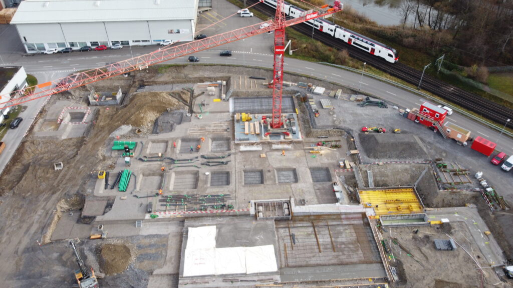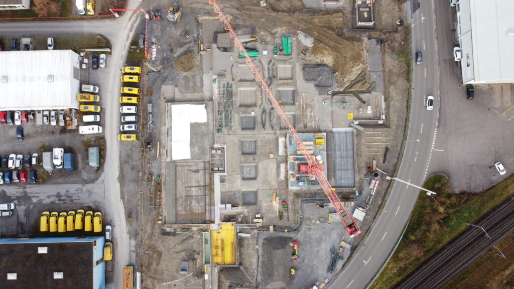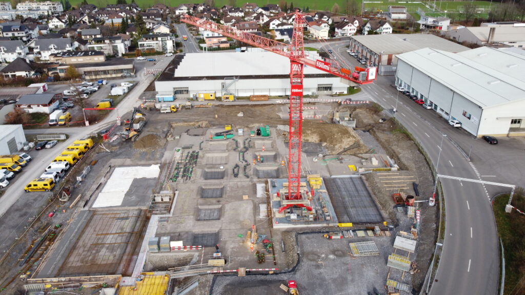Die Tiefbauarbeiten wurden von der Reichmuth AG ausgeführt, während die Föllmi AG sämtliche Baumeisterarbeiten übernimmt. Dabei stellen insbesondere die außergewöhnlichen Wandhöhen von bis zu 16 Metern sowie der Einsatz zweier großer Krananlagen mit 60 und 85 Metern Reichweite besondere Anforderungen an die Baustellenlogistik. Zusätzlich speziell wird der Überbeton der Deckenelemente als Monobeton erstellt. Ergänzend entsteht ein eigenes Trafogebäude für das EW-Lachen, das in den Bauablauf integriert wird. Die Fertigstellung des Neubaus ist für Ende Juni 2026 geplant.