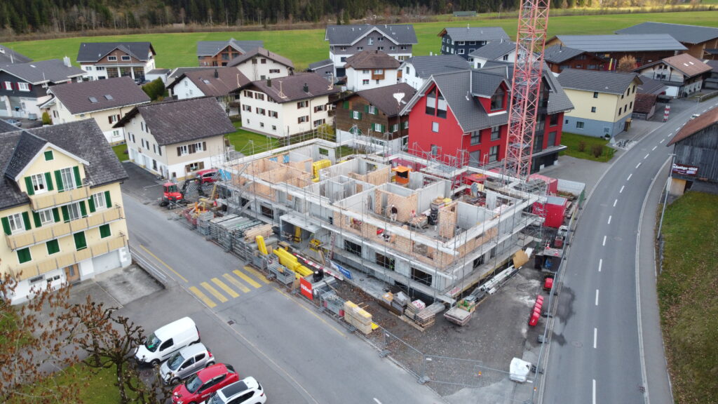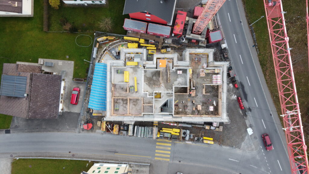Im Zentrum von Unteriberg realisieren wir derzeit ein modernes Mehrfamilienhaus mit sieben Geschossen und integrierter Tiefgarage. Die Bauherrschaft hat uns mit der Umsetzung des gesamten Projekts beauftragt – von der Baugrube bis zum fertigen Rohbau.Die Aushubarbeiten sowie die Böschungssicherung wurden in Zusammenarbeit mit der Swissbohr AG ausgeführt. Die Sicherung des Geländes erfolgte mittels offener Bohrpfahlwand.Der Hochbau wird grösstenteils in konventioneller Bauweise mit Ortbeton und Mauerwerk erstellt. Ausnahmen bilden die vorfabrizierten Treppenelemente im Treppenhaus und die Stützen in der Tiefgarage, die auf der Baustelle montiert werden.