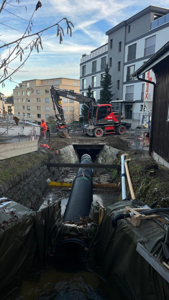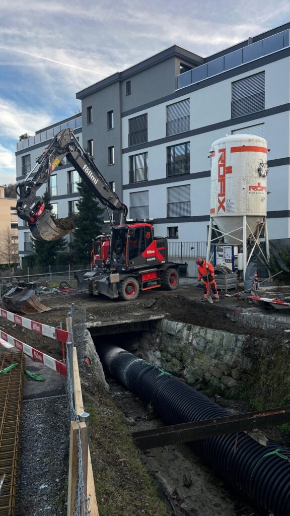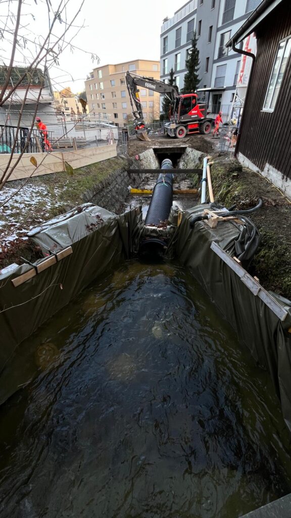Im Fürtitobel in Wollerau setzen wir wichtige Massnahmen zum Schutz vor Hochwasser und zur ökologischen Aufwertung des Krebsbachs um. Der Abschnitt «Alter Krebsbachweg» wird dafür umfassend erneuert und an heutige Sicherheits- und Umweltstandards angepasst. Ein zentraler Bestandteil des Projekts ist der Neubau der Betonbrücke am Alten Krebsbachweg. Die bestehende Brücke wird vollständig zurückgebaut und durch eine moderne Konstruktion ersetzt. Die Bachsohle wird offengelegt und zur Sicherung mit Blocksteinen, einer Niederwasserrinne und seitlichen Banketten stabilisiert. Zudem sichern wir die erodierten Ufer mit einem neuen Blocksatz. Eine bestehende Wasserleitung, die zum Teich führt, wird während der Bauarbeiten geschützt und integriert. Für die Umsetzung richten wir eine permanente Wasserhaltung mittels 800mm-Rohrleitungen ein und gewährleisten durch eine provisorische Fussgängerbrücke den sicheren Zugang während der gesamten Bauzeit. Mit diesen Massnahmen leisten wir einen nachhaltigen Beitrag zum Hochwasserschutz und zur ökologischen Entwicklung des Krebsbachs in Wollerau.