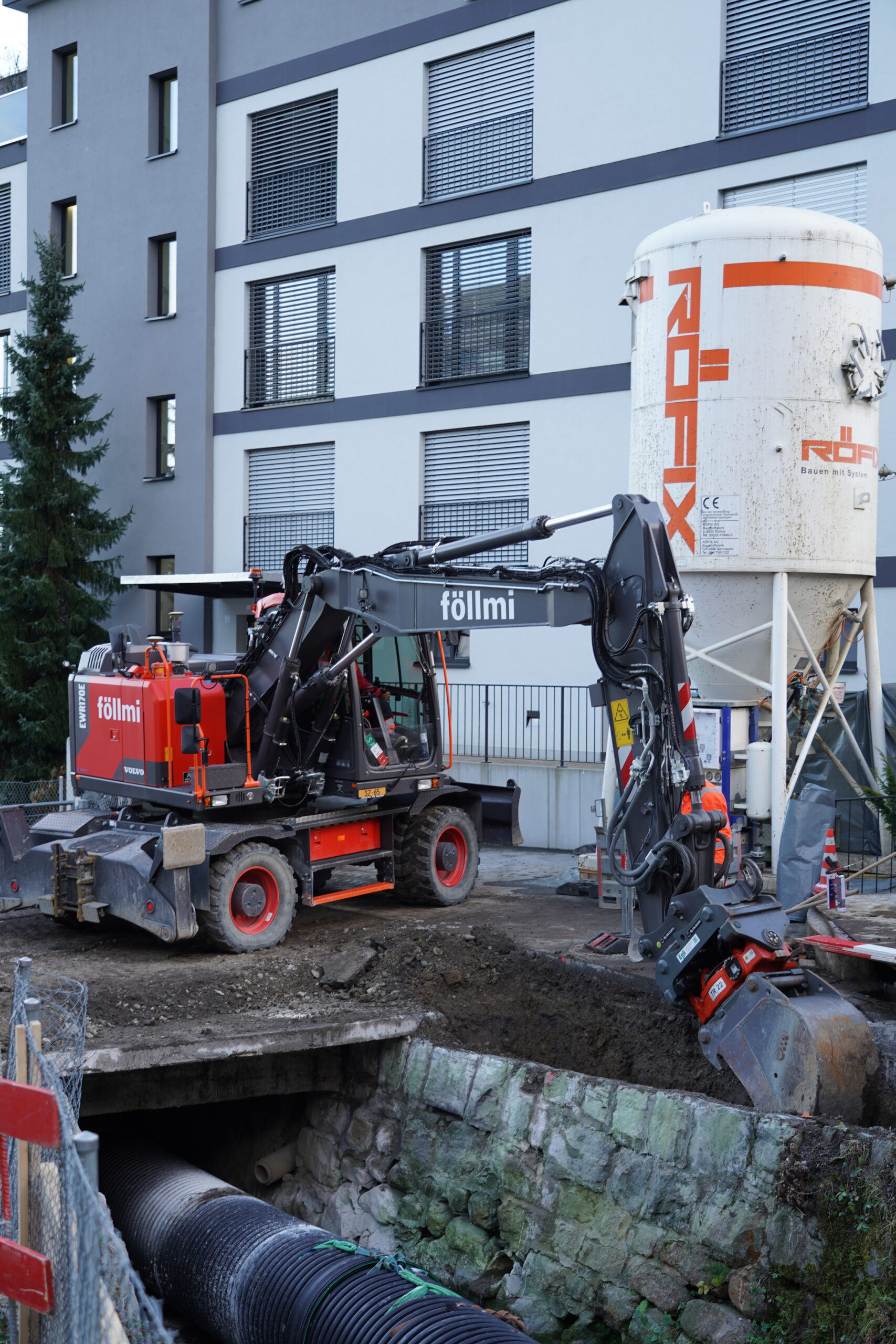 Im Fürtitobel in Wollerau setzen wir wichtige Massnahmen zum Schutz vor Hochwasser und zur ökologischen Aufwertung des Krebsbachs um. Der Abschnitt «Alter Krebsbachweg» wird dafür umfassend erneuert und an heutige Sicherheits- und Umweltstandards angepasst. Ein zentraler Bestandteil des Projekts ist der Neubau der Betonbrücke am Alten Krebsbachweg. Die bestehende Brücke wird vollständig zurückgebaut und durch eine moderne Konstruktion ersetzt. Die Bachsohle wird offengelegt und zur Sicherung mit Blocksteinen, einer Niederwasserrinne und seitlichen Banketten stabilisiert. Zudem sichern wir die erodierten Ufer mit einem neuen Blocksatz. Eine bestehende Wasserleitung, die zum Teich führt, wird während der Bauarbeiten geschützt und integriert. Für die Umsetzung richten wir eine permanente Wasserhaltung mittels 800mm-Rohrleitungen ein und gewährleisten durch eine provisorische Fussgängerbrücke den sicheren Zugang während der gesamten Bauzeit. Mit diesen Massnahmen leisten wir einen nachhaltigen Beitrag zum Hochwasserschutz und zur ökologischen Entwicklung des Krebsbachs in Wollerau.