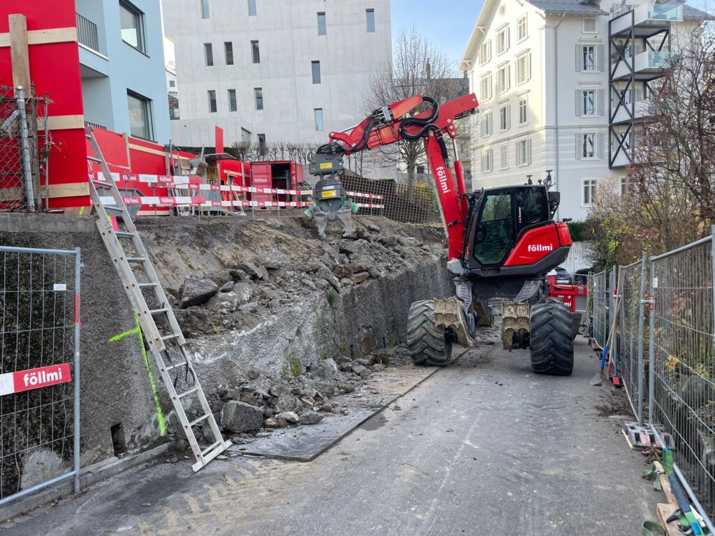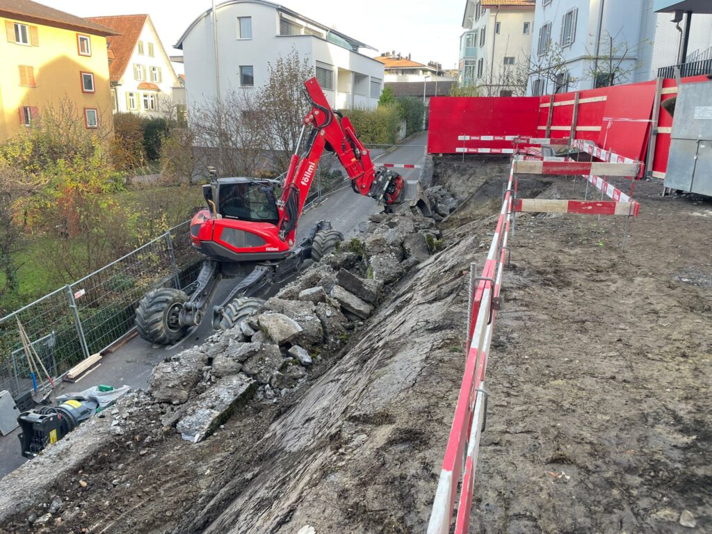 Während der gesamten Bauarbeiten ist die Wannentalstrasse in diesem Bereich vollständig gesperrt. Für den Aushub sowie die Ankerbohrungen können wir unseren Schreitbagger optimal einsetzen. Mit seinem flexiblen Anbaugeräten, unter anderem der Anker-Bohrlafette Morath, übernimmt er sowohl die Erdarbeiten als auch die präzisen Bohrungen im Gelände.