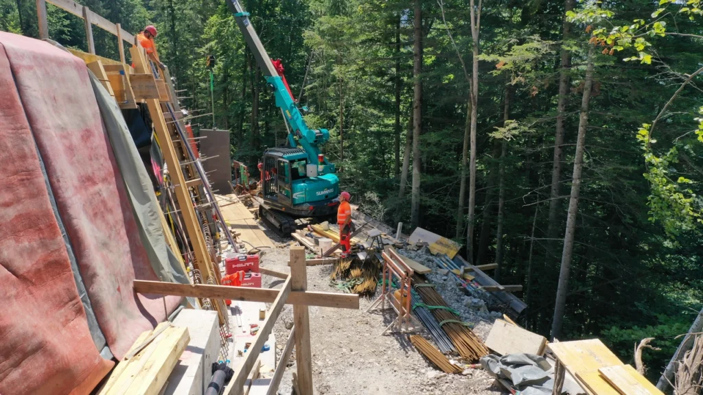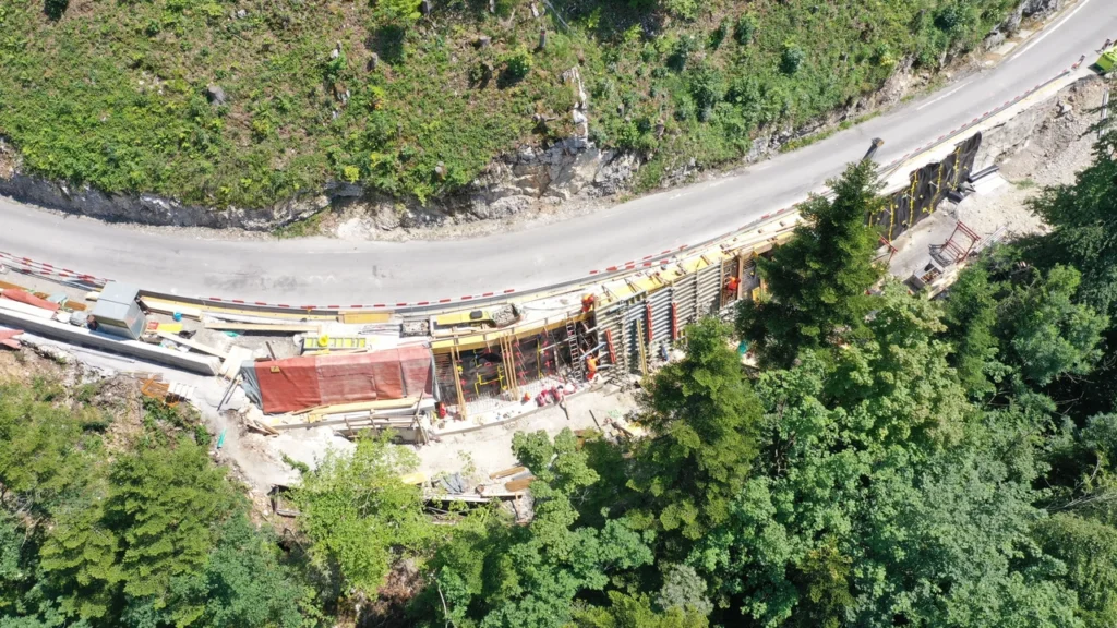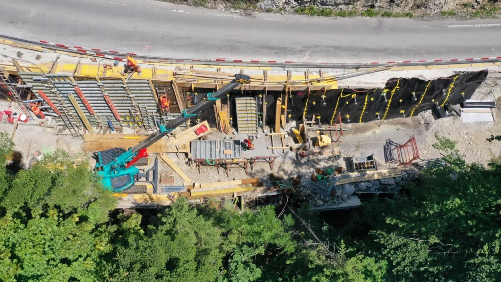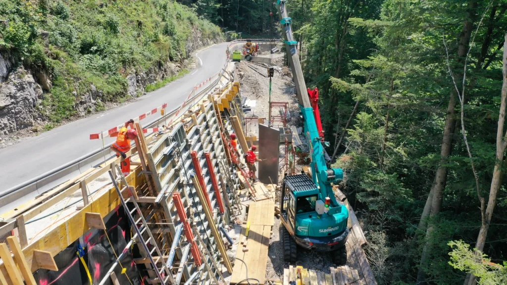 Die Ibergereggstrasse zwischen Stalden und Rickenbach bei Schwyz und dem Windstock wird saniert. Die Strasse wird einerseits verbreitert, anderseits werden verschiedene Massnahmen zur Verbesserung der Verkehrssicherheit ausgeführt. Wir sind von der Firma Käppeli Strassen- und Tiefbau AG Schwyz mit den Ortbetonarbeiten beauftragt worden. Einhäuptige Betonstützmauern bis 7 Meter Höhe und Rippenkonstruktionen bis 9 Meter Höhe werden durch uns ausgeführt.